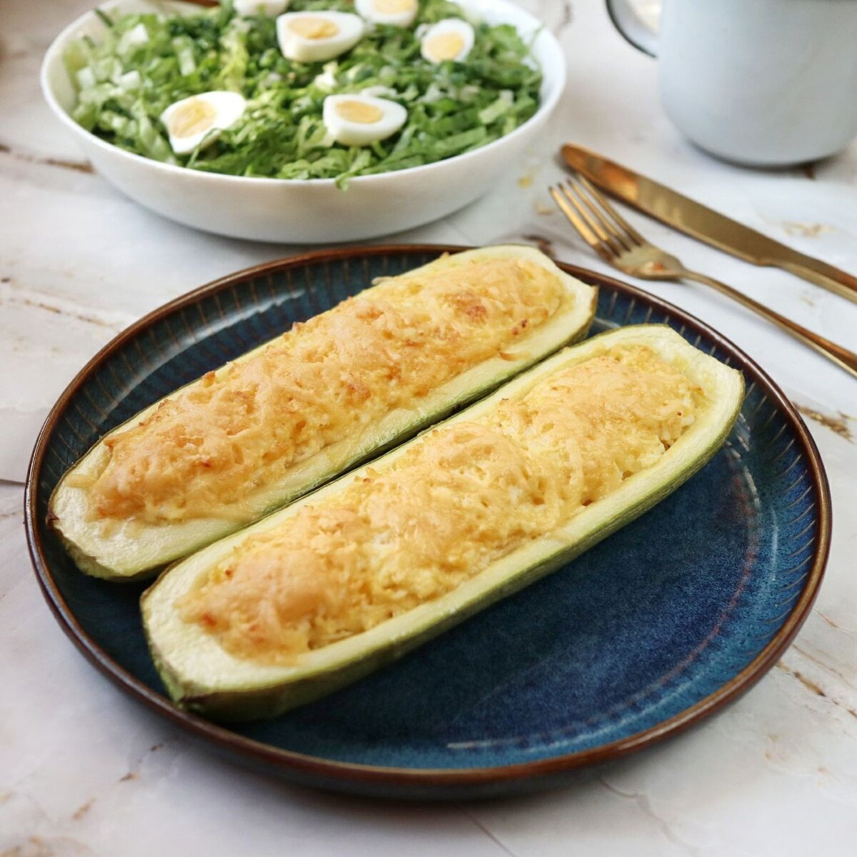 Минимум ингредиентов и чудесное полноценное блюдо на завтрак готово! Подойдет оно и в качестве закуски, и гарнира. Простое блюдо и при этом очень вкусное. Ингредиенты (на 1 порцию): 1. Кабачок помыть, разрезать вдоль и вынуть ложкой сердцевинки. Положить на противень, устланный пергаментом, посолить и поставить в духовку на 10 минут при 180 градусах. 2. Заняться начинкой. Яйца отварить и остудить под холодной водой. Сыр натереть на крупной терке, чеснок мелко порубить или воспользоваться чеснокодавилкой. Яйца натереть на мелкой терке. 3. Всё смешать, оставив немного сыра для того, чтобы посыпать сверху. 4. Достать кабачки и выложить начинку. Присыпать сверху небольшим количеством тертого сыра. 5. Вернуть в духовку и запекать ещё 20-30 минут при 200 градусах. Время зависит от духовки и корочки, которую хотите. Мне потребовалось 25 минут. КБЖУ: 546 / 35 / 42 / 10,3 Приятного аппетита! ----- Для тех, кому удобнее, у меня есть канал с рецептами в Телеграм.