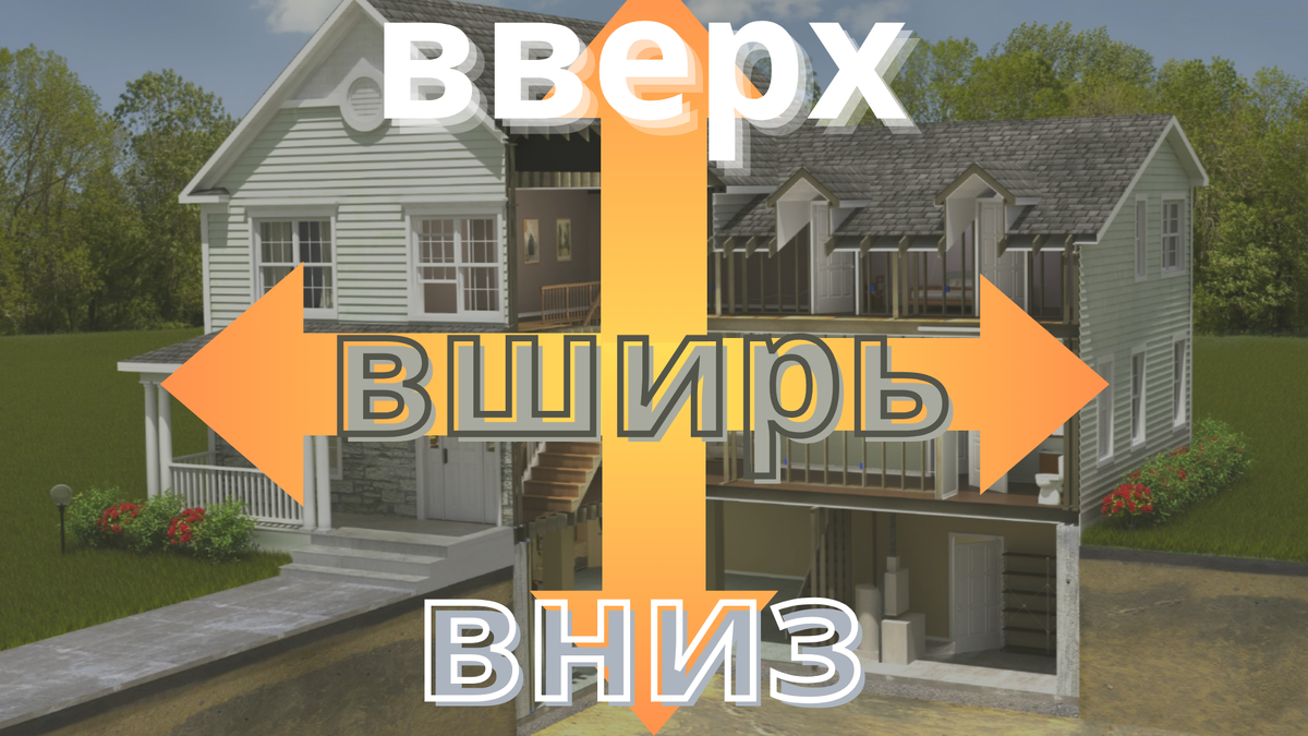 По сути, есть три варианта расширения площади дома: вверх, вниз и вширь.