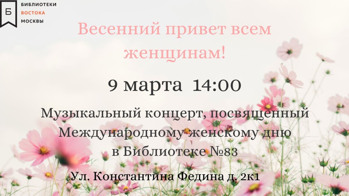 Приглашаем Вас на концерт, посвященный Международному женскому дню, который состоится в Библиотеке №83.