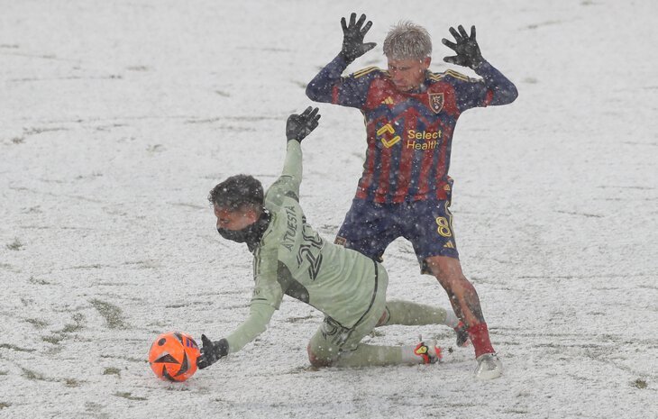 «Позор, что нам пришлось играть». Кадры, каких мы вряд ли ждали из МЛС. В субботу снежный матч сыграли не только в Ла Лиге, но и в Америке. «Лос-Анджелес» получил 0:3 от «Реал Солт Лейк» в обычно солнечной Юте – погода преподнесла неприятный сюрприз. Изначально матч отложили на два часа не из-за снега: был сильный ветер, шел проливной дождь. Как только футболисты вышли из раздевалок, газон уже был в снегу – и вместе со снежной бурей начала сверкать молния. Игру остановили уже на 4-й минуте. Прошел еще почти час. Когда возобновили, на газоне лежал снег, а снегопад не прекращался все 90 минут. В перерыве работники стадиона убирали его, чтобы футболисты могли рассмотреть линии. Играли оранжевым мячом – но обильный снег часто его тормозил. Некоторые футболисты решили надеть перчатки и шапки. В Солт-Лейк-Сити до сих пор -2 и идет снег – правда, уже не так интенсивно. Очень непривычная картина для МЛС. Больше похоже на осеннюю РПЛ. Пожалуй, самым известным футболистов на поле был вратарь «Ло