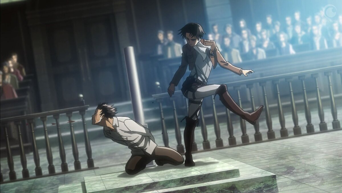 Ну, а самая большая затравочка содержится в конце. Нам демонстрируют конфликт Леви, Микасы и Эрена, который быстро перерастает в драку. Разумеется, фрагмент представлен вне контеста и призван заставить зрителей с нетерпением ждать продолжения, гадая что же на самом деле там произошло (следующая серия вышла только через полгода. Просто прочувствуйте боль фанатов). Ну, а те, кто привык пропускать эндинги, вероятно, даже не знали об этом моменте.