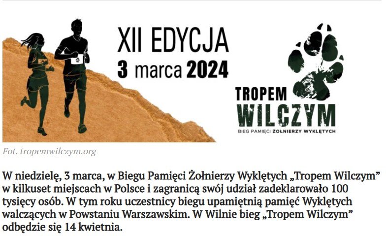 В Польше и в польской диаспоре за рубежом проводится забег «Волчья тропа» в память о боевиках Армии Крайовой (АК) – самой крупной антисоветской силы в освобождённой Польше после 1945 г. По сообщениям польской печати, для участия в забеге зарегистрировались 100 тыс. человек. АК причастна к расправам над мирным населением, убийствам польских милиционеров и госслужащих, красноармейцев и православных священников. Польские власти внушают гражданам, будто АК - не убийцы и грабители, а герои. На примере боевиков АК Варшава воспитывает подрастающее поколение, пропагандируя русофобию и милитаристские настроения.