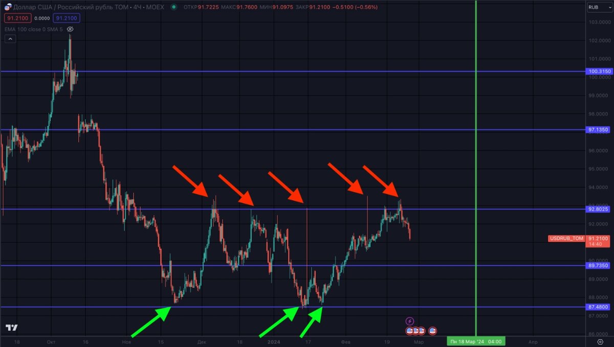 Последние месяцы иностранные валюты к рублю торговались в достаточно узком коридоре. Без значимых прорывов вверх или вниз. 💡 Есть основания предполагать, что такая “коридорная торговля” может уже скоро закончиться… Важное замечание: я буду использовать в примерах курс доллара, но направление и логика движений будут аналогичными и для юаня, евро или дирхама. Начнем с текущих факторов. Что происходит сейчас? С ноября доллар торгуется в коридоре, где 87,5р выступает локальным дном, а 92,8р - вершиной. Разметил вам стрелками на своем графике. Думаю, многие узнают эти уровни и график, так как мы к этому готовились еще с лета и многие читатели успешно воспользовались этим. Смотря холодной головой, понимаешь, что эти уровни сложились во время целого ряда факторов ЗА рубль: - Высокая ставка Банка России и курс на замедление инфляции - Снижение импорта, при сохраняющемся экспорте - Отсутствие эффекта роста бюджетных расходов - Действие указа об обязательной продаже валютной выручки - Продажи
