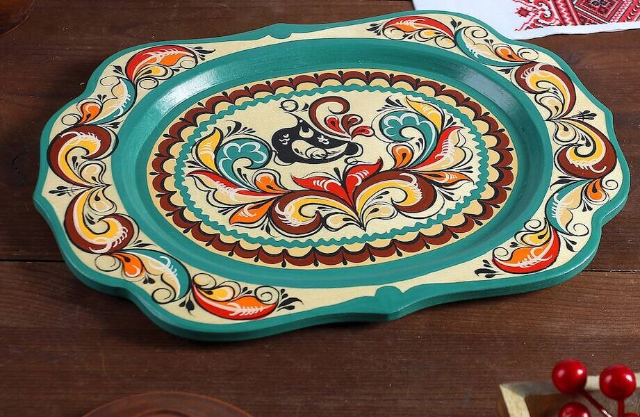 19. Петербургская. Как и Жостовская -, эта роспись специализируется на росписи подносов. Традиционный черный фон, правда, здесь сочетается с более богатыми, нежными и элегантными оттенками голубого, желтого и золотистого.