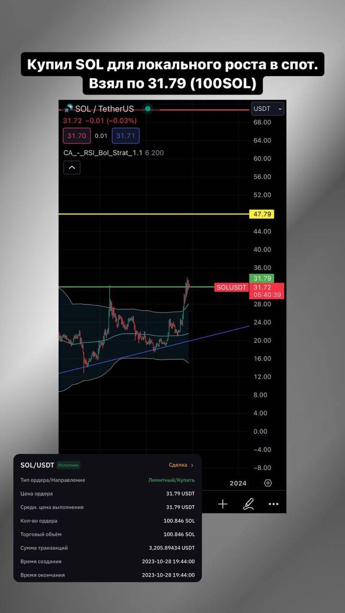 Предлагаю разобрать мои сделки по SOL, которые были осуществлены за последние три месяца. Итак, 28 октября я написал в публичной социальной сети, что купил SOL по цене 31.79 USDT за 100 SOL. На тот момент это составляло $3,205. Зона принятия решения была основана на росте основной криптовалюты BTC. На протяжении определённого периода мы находились в боковом флете после истечения времени мы вышли из него. Стоило ожидать, что график пойдёт за верхней границей ликвидности, которую я отметил, также как и рост начался на слухах о принятии ETF в ближайшие месяцы. Весь этот рост происходил на фоне этих слухов, поэтому я решил войти в некоторые сделки на этом этапе, одна из которых была по SOL. Ниже я отметил точку входа по SOL за этот период. На SOL вырисовалась такая же динамика: произошёл выход из флэта и закрепление на старших таймфреймах над ним. Поэтому было решено войти в эту сделку, также учитывая слухи по BTC и в целом общий положительный фон по рынку и агрессивному росту по SOL. С то