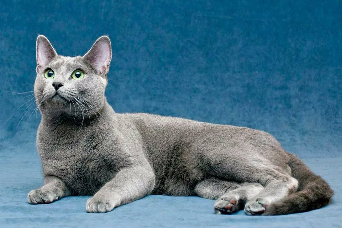 Кошки породы русская голубая бывают среднего или крупного размера. Имеют изящное тело и длинные, стройные ноги. Эта кошка настолько грациозна, что кажется, будто она передвигается на цыпочках. Голова имеет клинообразную форму с выдающейся зоной бакенбард и крупные уши. Яркие зеленые глаза широко посажены и имеют миндалевидную форму. По текстуре шерсть русской голубой непохожа на шерсть кошек других пород, и это основная отличительная особенность породы. Шерстка у этих животных — двойная, с густым подшерстком, короткая и приятная на ощупь. Несмотря на название породы, иногда среди русских голубых кошек встречаются особи с черным и белым окрасом. У типичных же представителей окрас равномерно голубой, с серебристым отливом. Русские голубые кошки настоящие эмпаты: тонко чувствуют настроение хозяина и подстраиваются под него. Это тихие, сдержанные интеллектуалы. С настороженностью относятся к новым людям, не демонстрируют чувства первому встречному. У русской голубой бывают периоды активнос