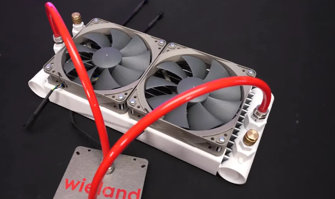 Известный ютубер и эксперт по аппаратному обеспечению Роман "der8auer" Хартунг получил уникальный прототип процессорного кулера, использующего инновационную термосифонную технологию. Термосифон - это пассивный метод теплообмена, основанный на естественной конвекции, где жидкость циркулирует без использования механического насоса. Компания Wieland, специализирующаяся на охлаждающих продуктах из меди и медных сплавов для процессоров, графических процессоров и памяти, разработала тихий альтернативный вариант жидкостных процессорных кулеров AIO. Исключение механического насоса позволяет снизить уровень шума, но при этом немного снижается эффективность охлаждения. На первый взгляд прототип игрового устройства Wieland Cold Plate выглядит как обычный радиатор размером 240 мм с двумя вентиляторами, диаметрально расположенными по бокам. Однако при ближайшем рассмотрении можно заметить, что с обеих сторон радиатора присутствуют цилиндрические корпуса соединенные с процессорным блоком. Благодаря
