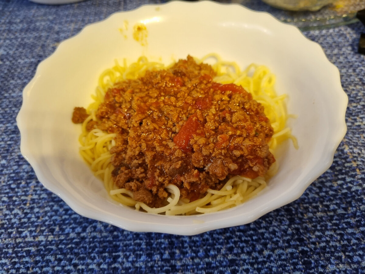 400 г говяжьего фарша 1 большая луковица 1 морковь 1 стебель сельдерея 1 банка помидор в собственном соку Соль, перец по вкусу Обжариваем мелко порезанный лук, сельдерей и натертую морковь (я делала и без моркови и без сельдерея). Добавляем фарш и обжариваем, разбивая комочки. Добавляем помидоры в собственном соку и тушим дооолго-доооолго, на самом медленном огне, в сотейнике часа два, в скороварке час.