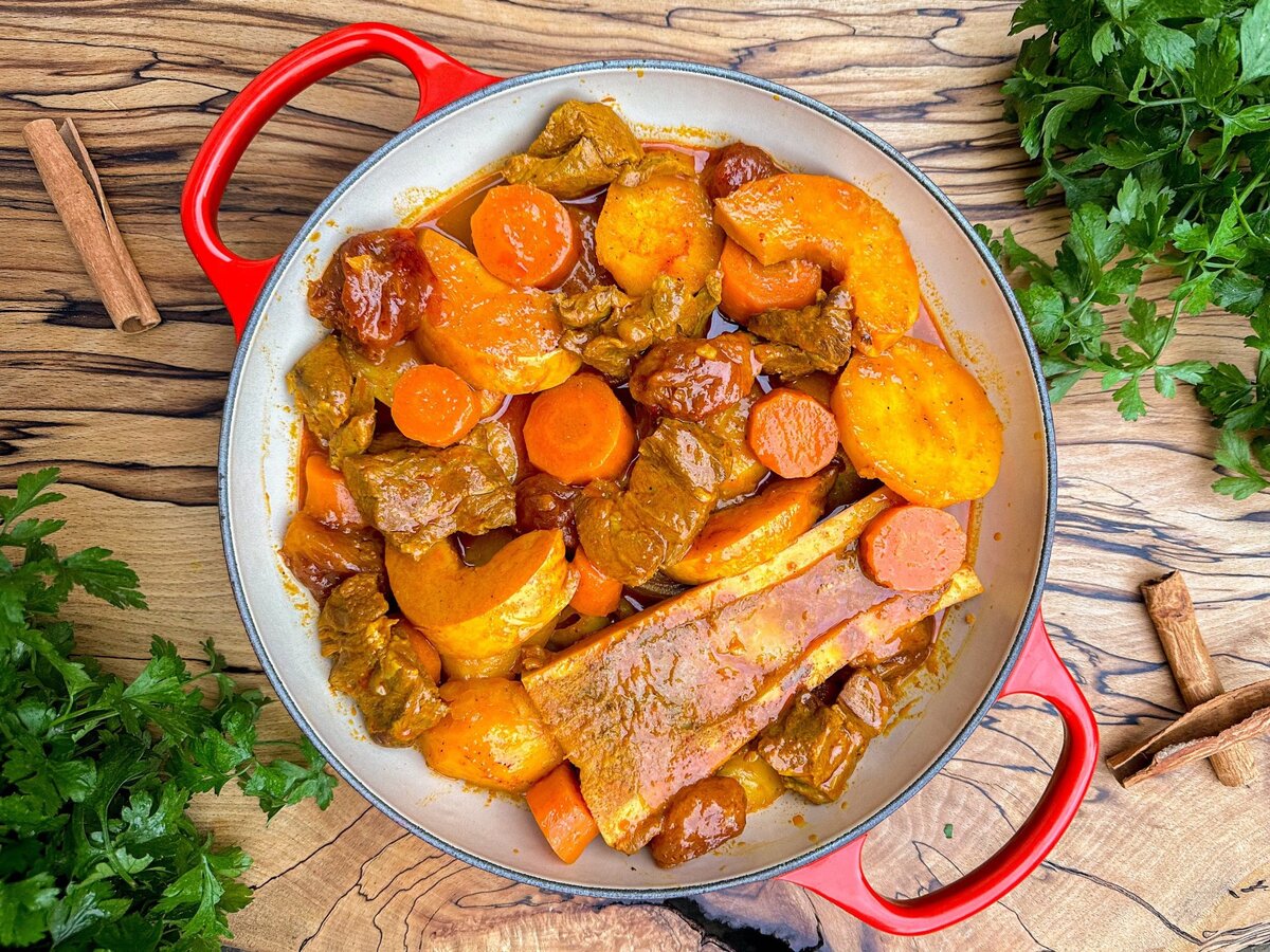 Хотя рагу из мяса и овощей выглядит очень простым, оно совсем не обычное. Мясо и овощи укладывают слоями и готовят на медленном огне, чтобы сохранить форму и цвет, а не смешиваться. Корнеплоды, которые используются в этом рагу – это лук, морковь и картофель, которые доступны круглый год в большинстве частей мира.