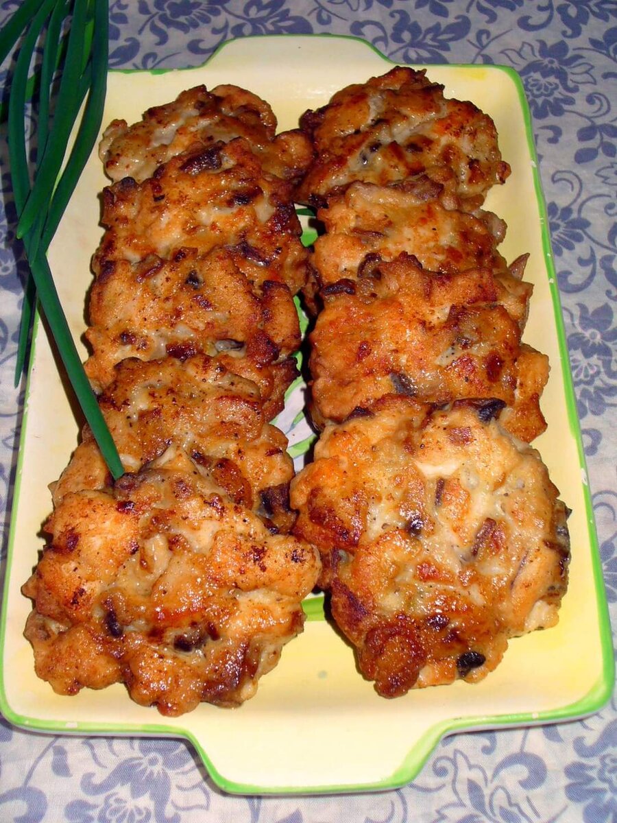 Куриный окорочок - 1 шт, Куриное филе - половина крупной филейки, Шампиньоны - 100 гр, Лук репчатый - 1 шт, Масло сливочное - 1 ст ложка, Сметана - 1 ст ложка, Мука пшеничная - 2 ст ложки, Яйцо куриное - 1 шт, Чеснок - 2 зубчика, Соевый соус - 1 ч ложка, Соль, перец, Масло растительное, для жарки. Лук и шампиньоны мелко нарезать и обжарить на сливочном масле. Мясо с куриного окорочка и филе - нарезать мелким кубиком, сложить в миску, добавить соль, перец, соевый соус, чеснок, пропущенный через пресс и оставить на час. Смешать куриное мясо и обжаренные с луком грибы, и взбитое вилкой яйцо.Добавить густую сметану, муку. Тщательно перемешать и оставить на 10 минут. В сковороде разогреть растительное масло. Выкладывать котлетки столовой ложкой, или руками. Обжарить до румяной корочки, затем перевернуть, закрыть крышку и довести до готовности. Сочные, ароматные, натуральные котлетки.