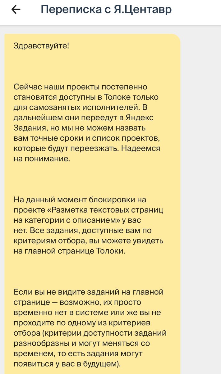 Всё началось с того, что на днях я увидела в Яндекс.Заданиях своего любимого заказчика Я.Центавр. Обрадовалась, правда само задание какое-то муторное было, я его и не запомнила, для меня главное было другое, а именно "Разметка текстовых страниц на категории с описанием", я понадеялась, что увижу это задание вскоре, раз другие начали появляться от этого заказчика. Но не появилось, начала думать, вдруг я в бане и ждать нет смысла. Потом меня осенило, что можно напрямую у заказчика спросить, "появится ли задание ?" и не забанена ли я. Увы, то единственное задание от Центавра не приходит, соответственно я не могу нажать на него и открыть строку "написать заказчику". Но ведь есть ещё Толока, и там однажды я уже писала Центавру, по этому же вопросу, кстати тогда, после моих обращений, " Разметка" вскоре появилась, может просто совпадение. Я поспешила в Толоку, предыдущая переписка сохранена в диалоговом окне, так что без проблем смогла написать им вновь. Ответили быстро, но немного ввел