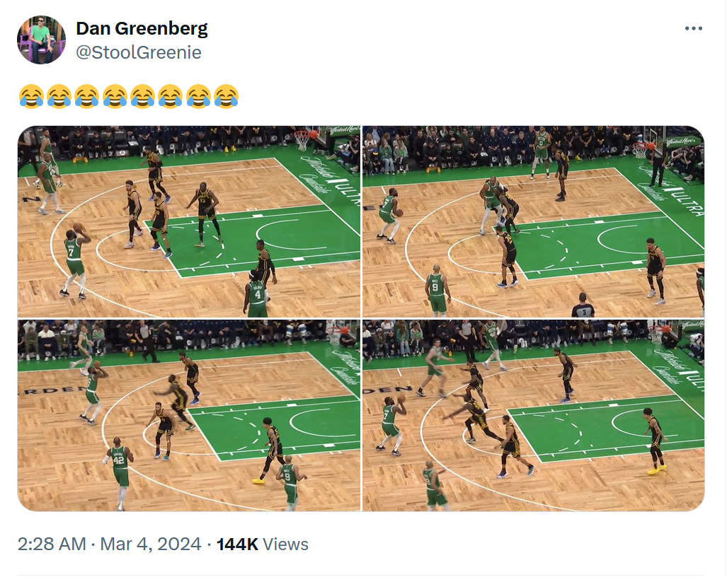 Ведущий First Take Стивен Эй Смит, как это часто бывает, комично кипел и во время большого перерыва попросил у всей страны прощения за увиденное, а также заявил, что сам готов взять мяч и войти в игру (и дать ГСВ 1,5 очка со скамейки!)
