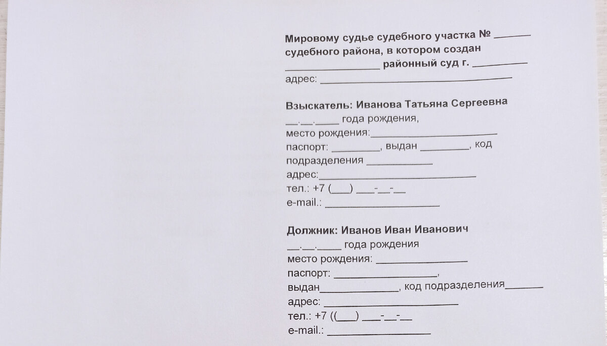 - аналогичные сведения о должнике: ФИО, дата и место рождения, паспортные данные, место жительства, один из идентификаторов (СНИЛС, паспорт, ИНН, номер водительского удостоверения), а также место его работы, если известно. Дополнительно я рекомендую указывать контактный телефон и электронную почту.