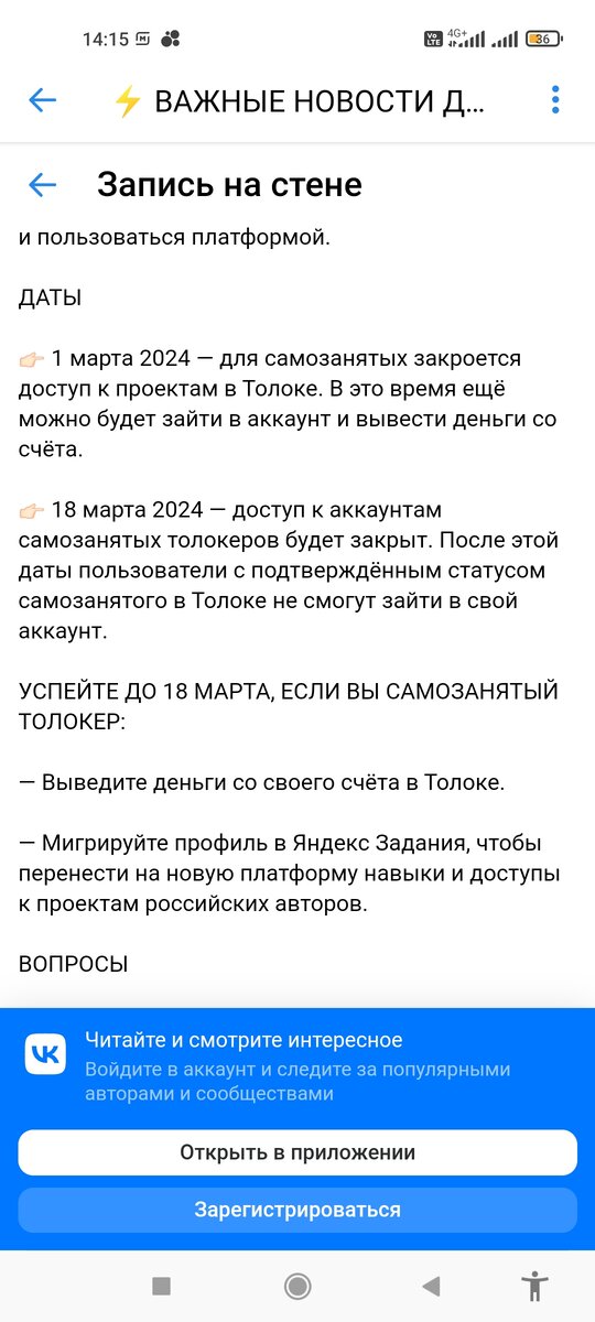 Добрый день дорогие подписчики и друзья!! Хочу вам сообщить , что с марта месяца доступ к проектам и заданиям для самозанятых в Толоке закрывается! Надо успеть вывести деньги заработанные там до 18 марта ! Можно будет выполнять задания которых стало гораздо меньше , но уже не в статусе самозанятого , а просто как исполнитель. Вот последние новости с Толоки . В общем я перенесла свой профиль в Яндекс задания и продолжаю их выполнять ! За февраль мне удалось заработать вместе с Толокой и Яндекс заданиями 1935 руб ,64 коп. В Яндекс заданиях проекты и задания фактически такие же как и Толоке Вот некоторые из заданий и оплата за а них начисляется в рублях !!! Вот такие сейчас зароботки , но будем продолжать ! Всем хорошего дня !!