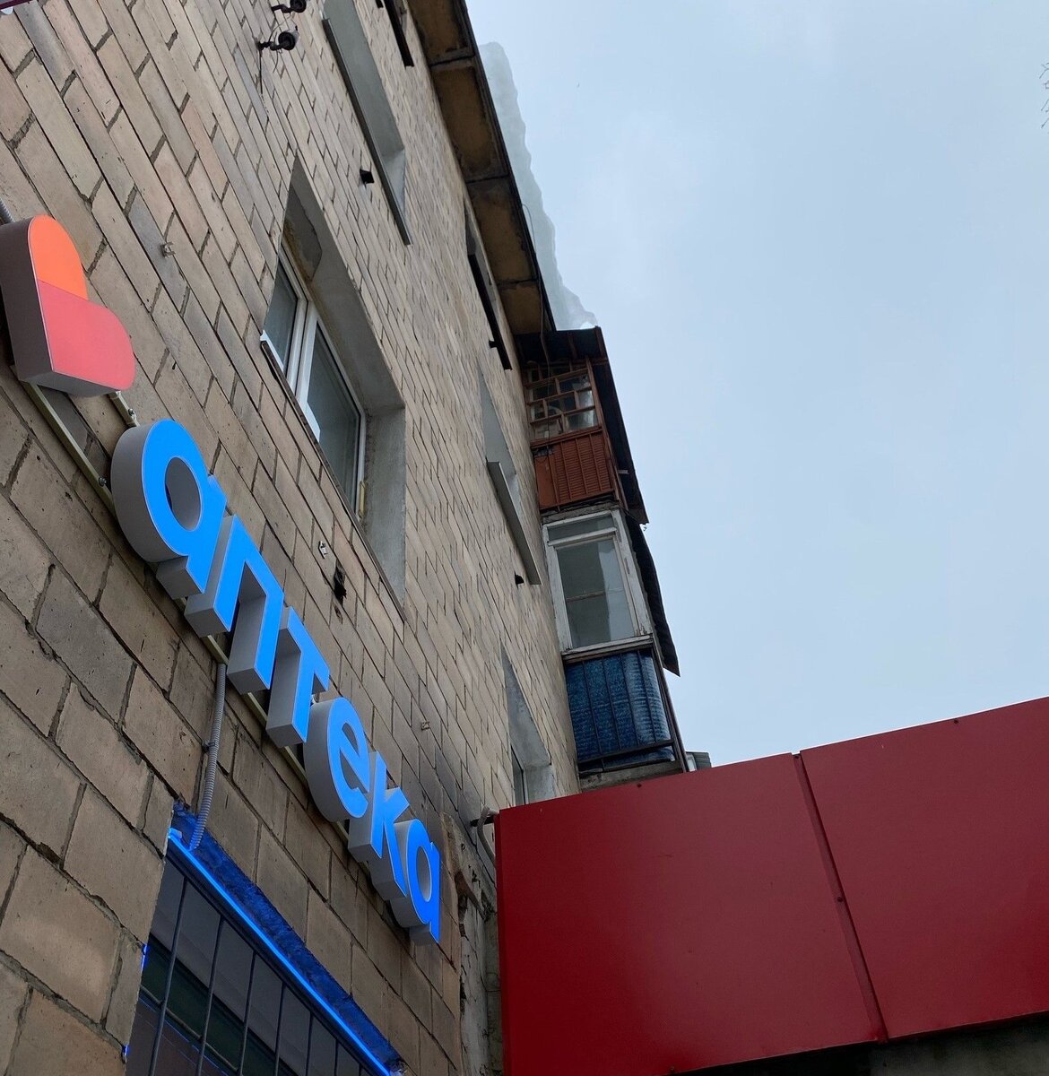Наледь нависает прямо над входом в аптеку.