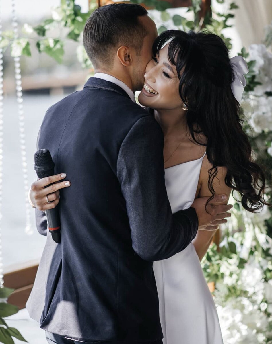 Аня и Кирилл устроили красивую камерную свадьбу. На ней Аня была в лёгком белом платье, рядом были белые цветы. Мама проводила невесту к жениху, на свадьбе присутствовали только самые близкие родственники.