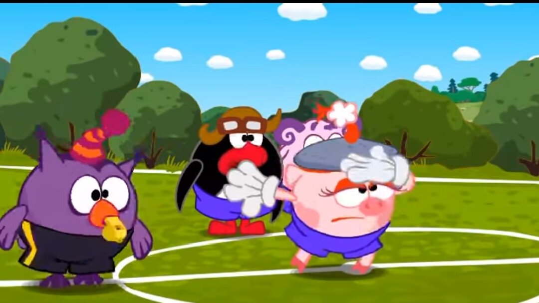 Крош перехватывает инициативу, он устремляется к воротам соперника, ведет мяч по полю, игрока преследуют Пин и Бараш, но каков дриблинг Кроша!