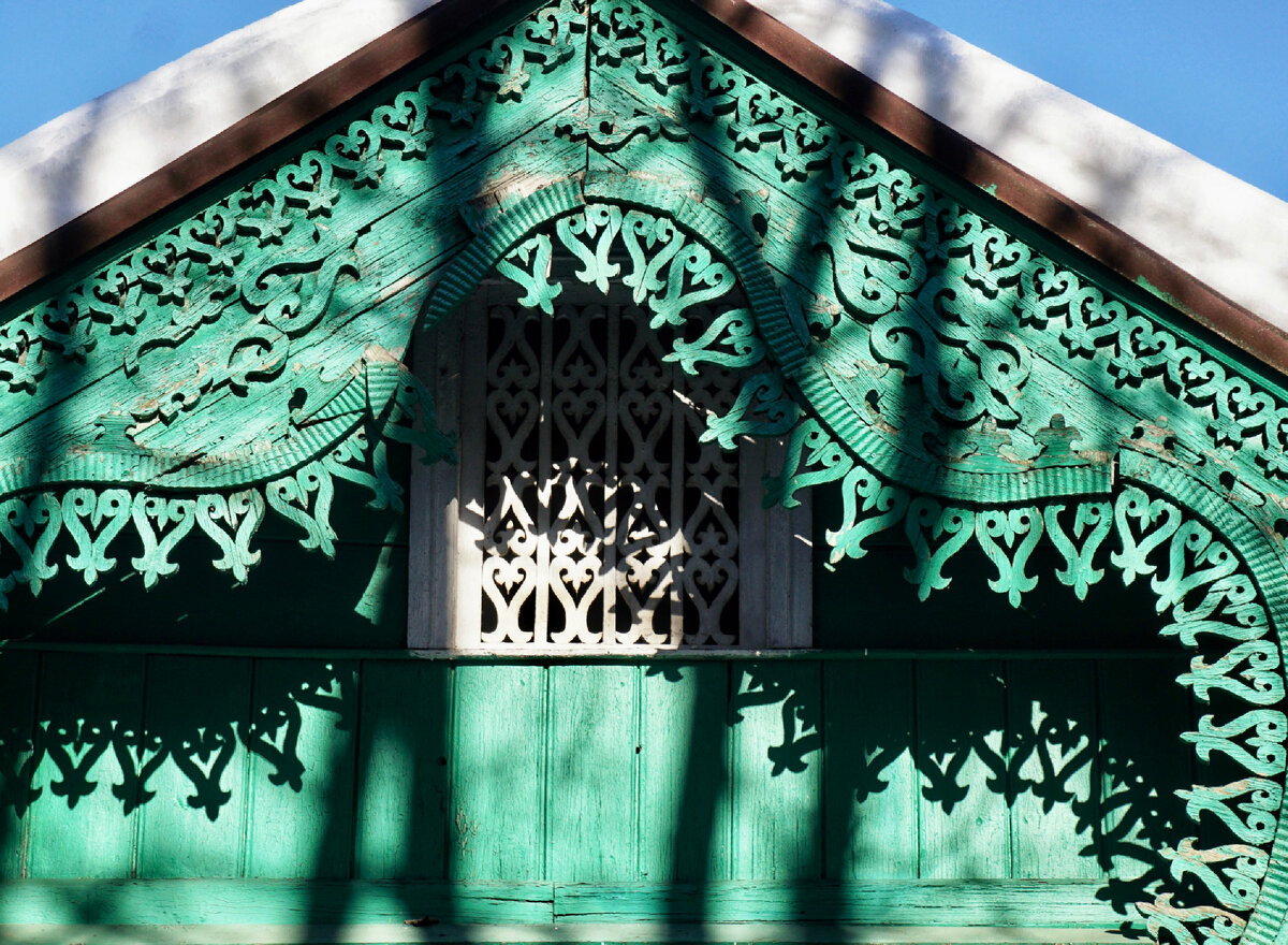 Верхний этаж радует количеством деревянной резьбы. Окна переднего фасада обрамлены изящными наличниками, окна же по бокам и сзади выглядят скромно. Выше расположен карниз: резной на переднем фасаде и на боковом слева, обычный во всех остальных местах. На самом верху есть слуховое окно в форме кокошника.
