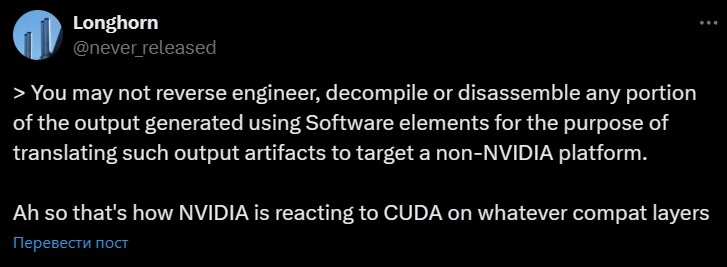Компания NVIDIA оказалась против использования слоев трансляции для использования кода CUDA на видеокартах, которые таковой нативно не поддерживают. То есть речь идет обо всех видеокартах не от NVIDIA. Так в пользовательском соглашении CUDA 11.5 написано, что пользователям запрещается обратная разработка, декомпиляция или разбор любого из участков кода CUDA для последующего использования слоев трансляции на платформах не от NVIDIA. Такое соглашение полностью запрещает использование ZLUDA, а также вставляет палки в колеса нескольким китайским производителям видеокарт, которые заявляли о нативной поддержке CUDA на их ГПУ. При этом аналогичной строчки в пользовательском соглашении у CUDA 11.4 нет.