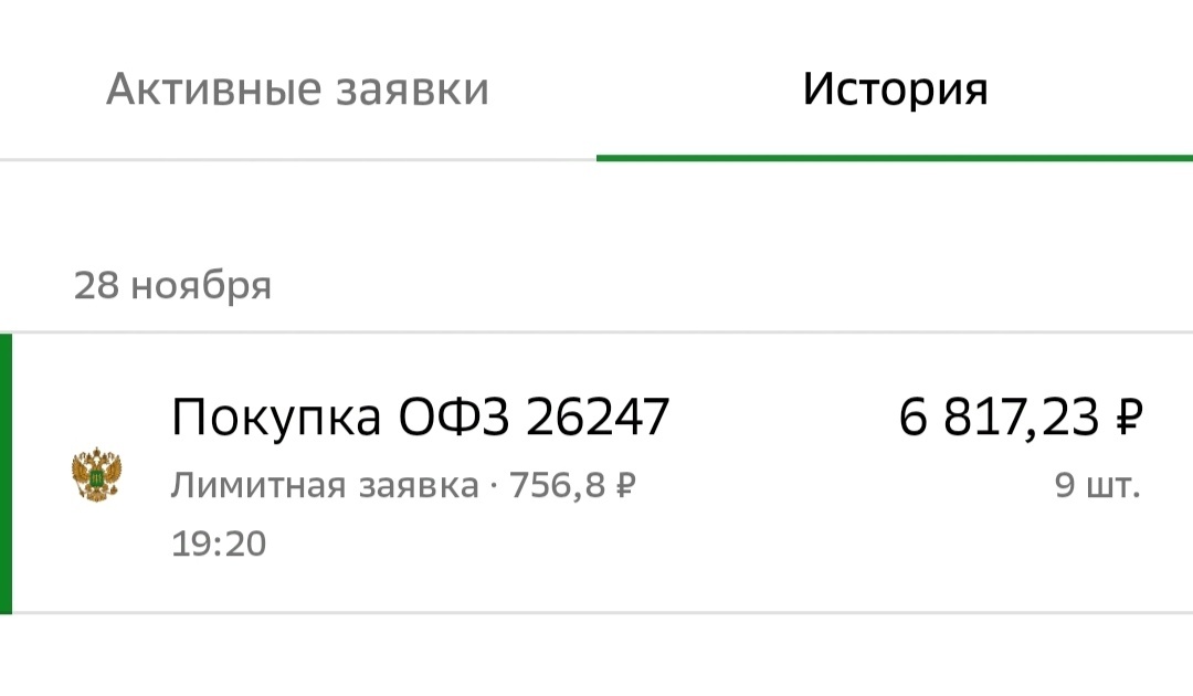Дотянула до последнего и вчера решила покупать и покупать по плану. Пополнения ИИС в ноябре: Покупки, а точнее покупка простая, по плану: Часть моего долгосрочного портфеля состоит из облигаций (38%). Облигации разные, подбирались так, чтобы купоны приходили ежемесячно примерно в равных долях - цель 2000+₽ купонами каждый месяц. Как раз на ноябрь приходится провал, поэтому: Покупка ОФЗ 26247 - 9 штук. В итоге еще будет небольшая покупка облигаций в январе и план по доходу от облигаций в 2000₽ в месяц будет выполнен. Предвосхищая вопрос зачем мне при такой неопределенности облигации? Ответ: купоны дают стабильный денежный поток каждый месяц для покупки активов. Всем успехов и зелёных портфелей. И подписывайтесь на мой канал про инвестиции в облигации и дивидендные акции в телеграмм! И тут подписывайтесь! Я не собираюсь останавливаться!
