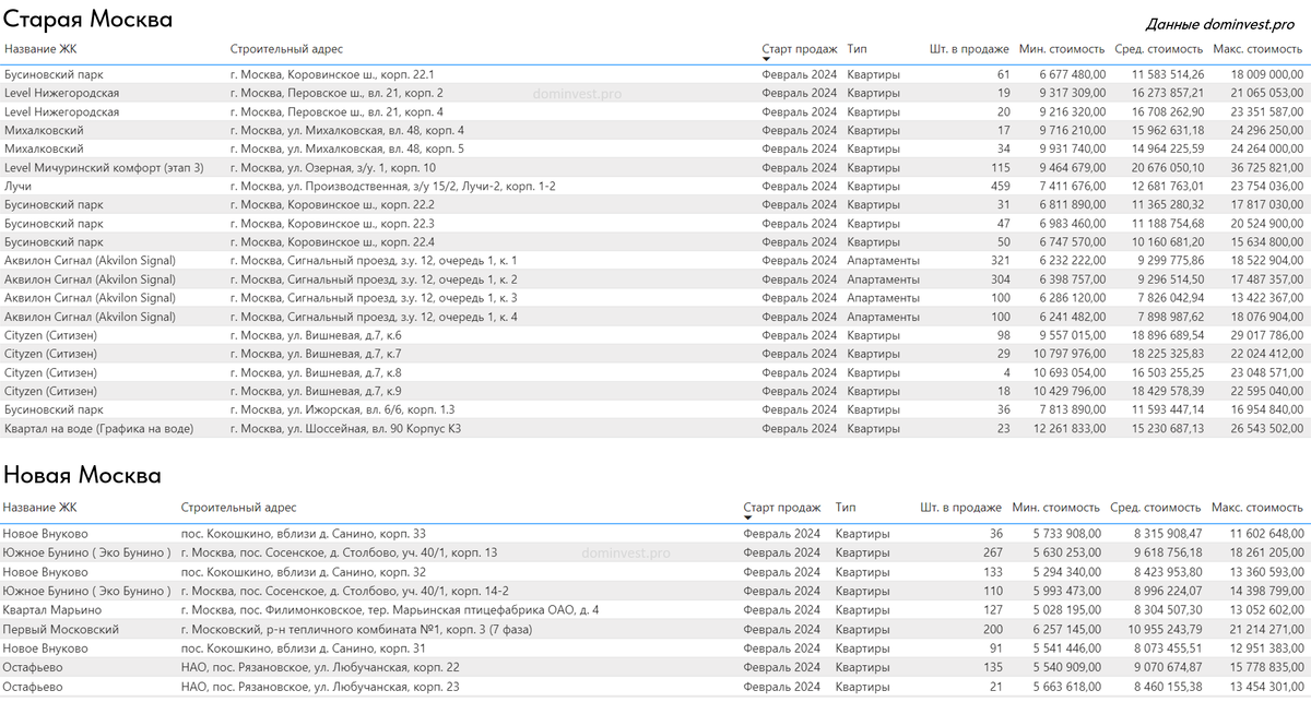 Первые числа марта, а это значит, что мы провели обновление данных за февраль 2024 и делимся информацией, где купить квартиру на старте продаж. Итак, в феврале 2024 года в продажу вышло 29 корпусов в 13-ти жилых комплексах: 20 корпусов в Москве и 9 корпусов Новой Москве. Интерактивные графики динамики цен, сравнение с конкурентами -> в кабинете аналитики для инвесторов на сайте dominvest.pro Как пользоваться отчетами смотрите в нашем видео-ролике тут Стоимость квадратного метра: Старая Москва: 419 770 ₽ (средневзв.) Новая Москва: 260 620 ₽ (средневзв.) Стоимость лота: Старая Москва: 25 111 276 ₽ (средняя) Нова Москва: 11 487 532 ₽ (средняя) Самый дешевый лот в границах МКАД: Квартиры: Светлый мир. Станция Л - от 6,4 млн ₽ Апартаменты: CLEMENTINE - от 4,6 млн ₽ Самый дешевый лот Новая Москва: Квартиры: Квартал Марьино - от 5 млн ₽ Апартаменты: Движение Говорово - от 5,6 млн ₽ Старты продаж - новые ЖК Cityzen - MR GROUP. м. Тушинская 4 корпуса. Бизнес-класс. Шаговая доступность от метро