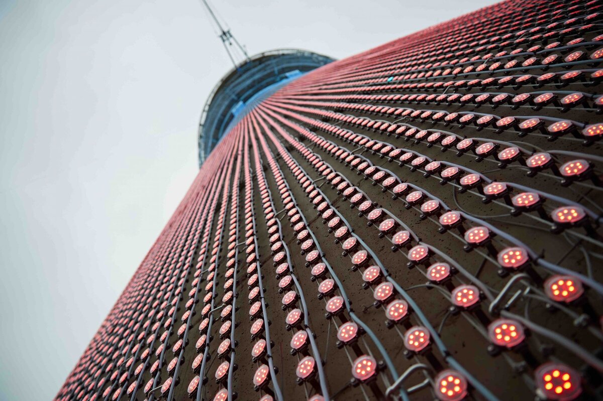 Единственный в России и один из немногих в мире цилиндрических экранов потребляет без малого 740 киловатт при пиковых нагрузках. В рабочем режиме показатели меньше, но тоже впечатляющие — 200–300 киловатт. То есть 40–60 типовых квартир! Неудивительно: экран представляет собой две секции суммарной площадью 3753 квадратных метра и состоящие из 424 тысяч кластеров-пикселей. Помимо собственно медиафасада в показатель мощности входит архитектурно-художественная подсветка телебашни, которая акцентирует ствол, кольца — открытые балконы.