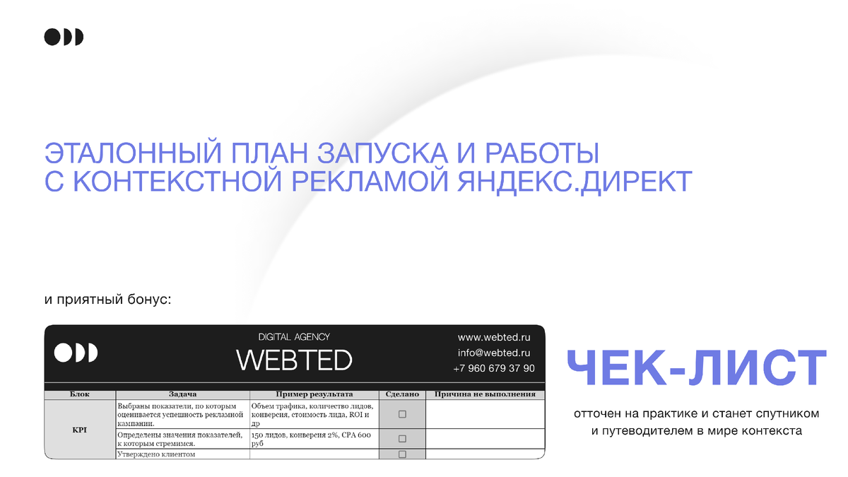 За 3 года с момента формирования WEBTED мы реализовали более 200 проектов в контекстной рекламе и наконец сформировали для себя тот самый эталонный чек-лист работы с данным инструментом. Внимание🥁 Тот самый эталонный чек-лист, который создавался не просто сертифицированными специалистами, а отточен на практике и станет спутником и путеводителем в мире контекста 👇 3 раздела, 10 блоков и 88 задач стоит перед специалистом нашего агентства с каждым новым запуском И каждый блок / задача несет ценность и сказывается на результате работ и картине самого проекта Кратко выделим некоторые для пояснения: Прежде чем начинать делать, необходимо понимать, что хотим получить. При старте работ с клиентами мы обязательно устанавливаем ключевые показатели эффективности запусков, исходя из целей. Зачастую, это performance-запуски с целью привлечения заявок и продаж. И да, если мы стремимся к ним, то должны понимать уровень компетентности отдела продаж, что крайне важно. На рыбалку с деревянной удочкой