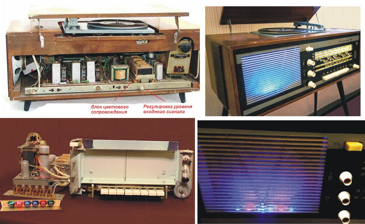 Однажды сосед попросил посмотреть радиолу «Гамма» (как выяснилось, сгорел накал одной из ламп). При ремонте обнаружил перед динамиком ряд цветных лампочек. На мой вопрос сосед ответил, что когда-то, эти лампочки мигали в такт с музыкой. Внимательно осмотрев приемник, обнаружил переменник установленный с обратной стороны. Покрутил его, и цветомузыка ожила (правда только три лампочки, остальные были перегоревшими). Это меня так впечатлило. Изучив схему, и устройство приемника понял, что это все можно безболезненно изъять и под твердые гарантии соседу, что остальное будет работать, упросил отдать это чудо, и с радостью снял блок и лампочки.