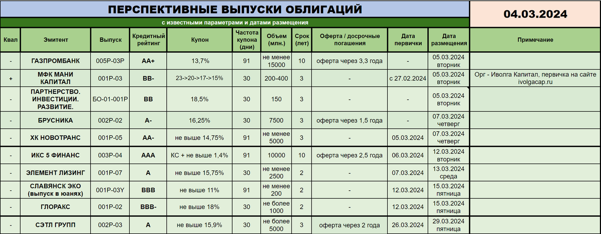 🍃 ЭЛЕМЕНТ ЛИЗИНГ (🅰️) выкатился с параметрами нового выпуска еще пятничным вечером, однако было уже не до него :) Наверстываю упущенное - эмитент в рамках выпуска 001Р-07 планирует занять не менее 2,5 миллиардов рублей. Условия, кстати, не сказал бы, чтобы очень интересные: 2 года, ежемесячный купон с ориентиром не выше 15,75%. Кажется, что еще вполне актуален и прошлый выпуск эмитента 001Р-06 $RU000A1071U9, в свое время давший небольшой апсайд. Да и, кажется, купон новинки имеет все шансы сравняться. В любом случае имею честь сообщить, что сбор заявок пройдет 7 марта, а вот торги на бирже начнутся лишь 13 числа.