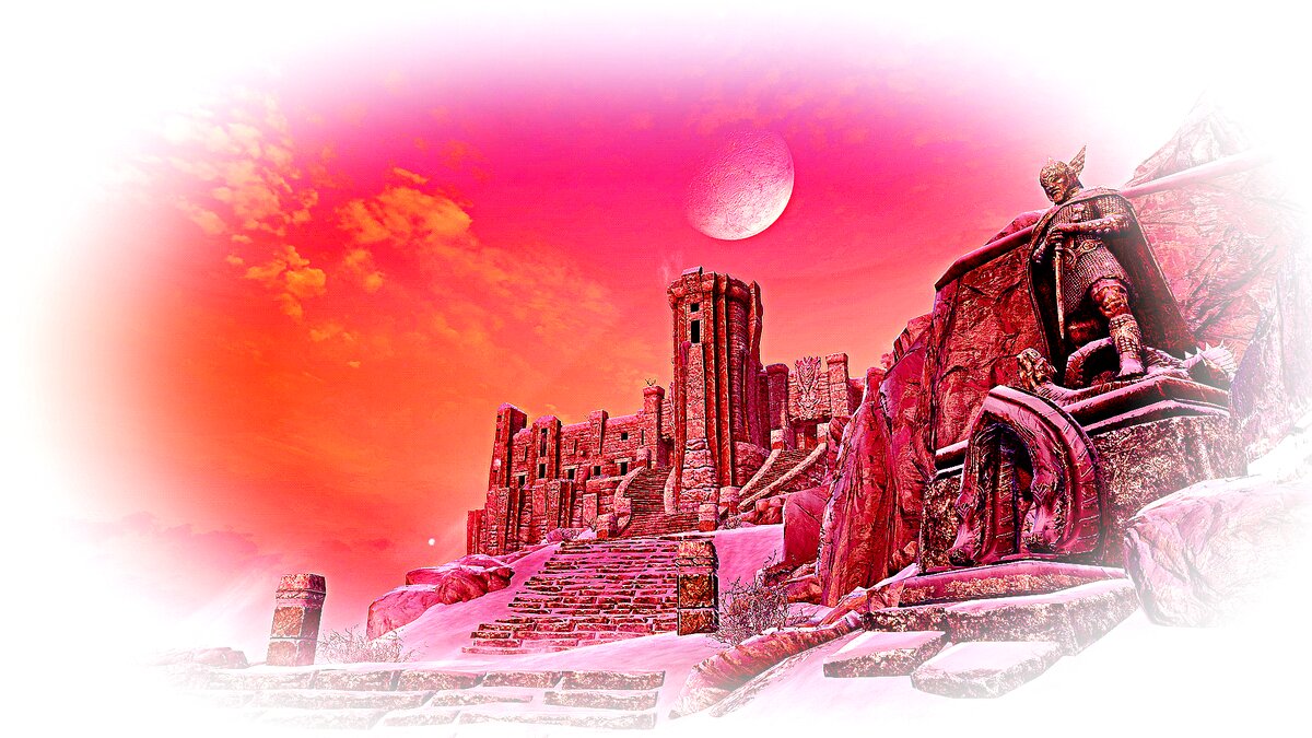 Владение Вайтран …И не надо кидать меня тапками, уважаемые читатели! Высокий Хротгар, как и сама Глотка Мира расположены в владении Вайтран – я проверял! Да, деревня Айварстед в Рифте, а вот перейдя через мост и начав подниматься в гору, мы оказываемся в соседнем владении. Впервые Довакин отправляется на Высокий Хротгар по зову Седобородых: Путь туда ведёт по Семи Тысячам Ступеней – хотя в игре их, конечно же, значительно меньше – но зато как звучит! По дороге Дова встречается с охотниками, паломниками и пару-тройку раз избавляется от напавших на него хищников – это могут быть медведи, волки, ледяные приведения и тролли. На всём пути установлены каменные стеллы с резными табличками: Если прочесть их все, то можно получить вот такой эффект: Наконец впереди появляется величественное сооружение – монастырь Седобородых. Как бы там не говорили (ярл Балгруф Старший в частности), но «самое мирное место» в Скае по своей сути – явно военный форт, бастион. Смотрите, как чётко он преграждает