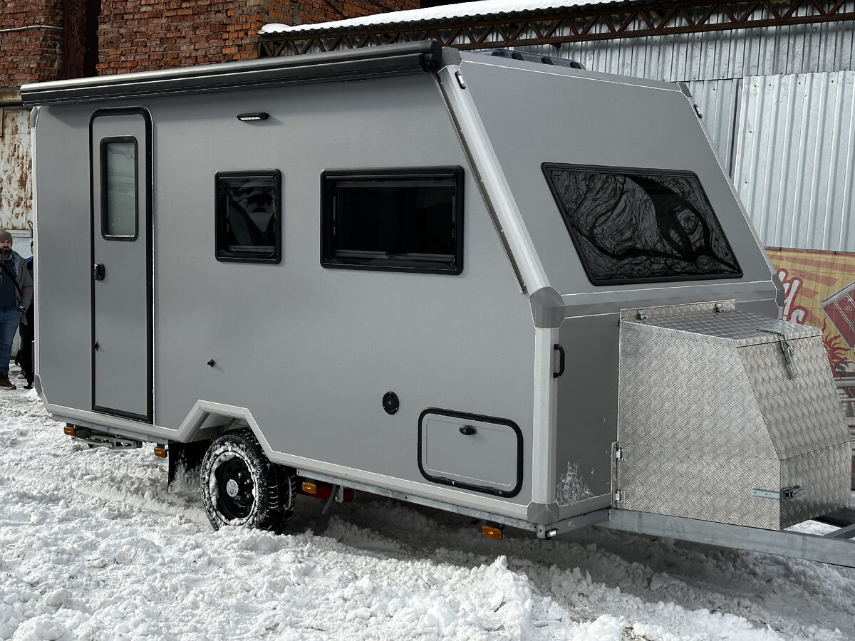 - Стены прицепа из легких сэндвич-панелей: 30 мм пенополистирол (XPS), снаружи сталь с полимером, внутри покрытие из стеклопластика. Такие стены хорошо держат тепло в холодную погоду, считаются долговечными и широко используются в премиальных европейских караванах.