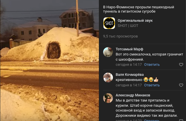 Администрация города Наро-Фоминска отрицает вовлечение коммунальных служб в создание снежного прохода. Власти пообещали съездить на место и посмотреть. Они вообще сомневаются, не фейк ли. Если тоннель будет найден, его обещают снести вместе с сугробом. Добавлено 4 марта в 20:11 (мск): Тоннель проверили.
