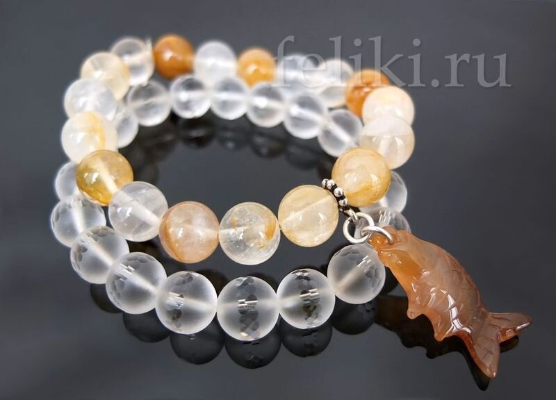 Комплект браслетов из кварца и горного хрусталя. Собраны на резинке Stretch Magic®. Диаметр камней 10,5 мм. Сердоликовая рыбка ручной работы, её размер 28*12 мм. Браслеты подходят для запястья обхватом 16-16,5 см. Артикул на сайте 1147.