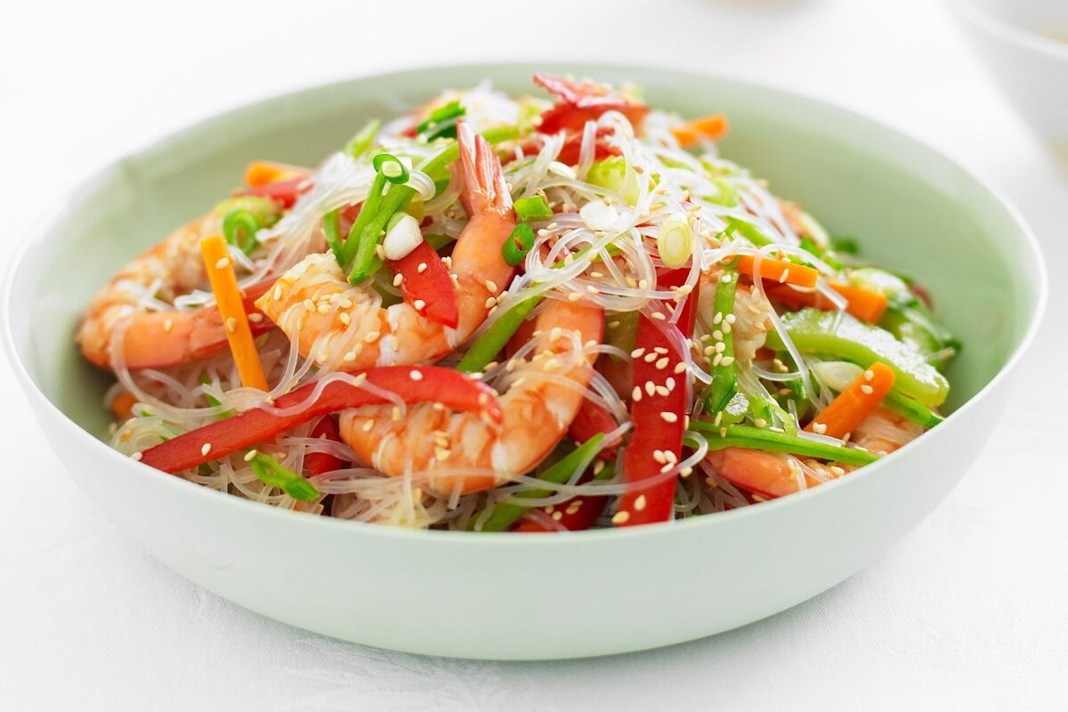 Если вы любите или хотите попробовать фунчозу, то этот вариант приготовления вас не разочарует. Готовится блюдо быстро и просто. Получается вкусное лёгкое блюдо с ярким вкусом. ---------------------------------------------------------------------- Ингредиенты: Фунчоза - 50 г. Морепродукты варёно-мороженые - 180 г. Перец болгарский красный - 150 г. Морковь - 80 г. Лук репчатый - 80 г. Чеснок - 3 зубчика Соевый соус - 50 мл. Соль - по вкусу Перец чёрный молотый - щепотка Масло растительное - 3 ст. л. ---------------------------------------------------------------------- Кол-во порций: 2 Время приготовления: 25 мин. Категория: Вторые блюда Тип блюда: Из морепродуктов Национальная кухня: Китайская ---------------------------------------------------------------------- Приготовление: 1. Понадобится 200 мл кипятка. Варёно-мороженые морепродукты надо разморозить заранее. Состав может быть любым, главное - качественные морепродукты. Лук и чеснок очистить. 2. К морепродуктам добавить соевый соус
