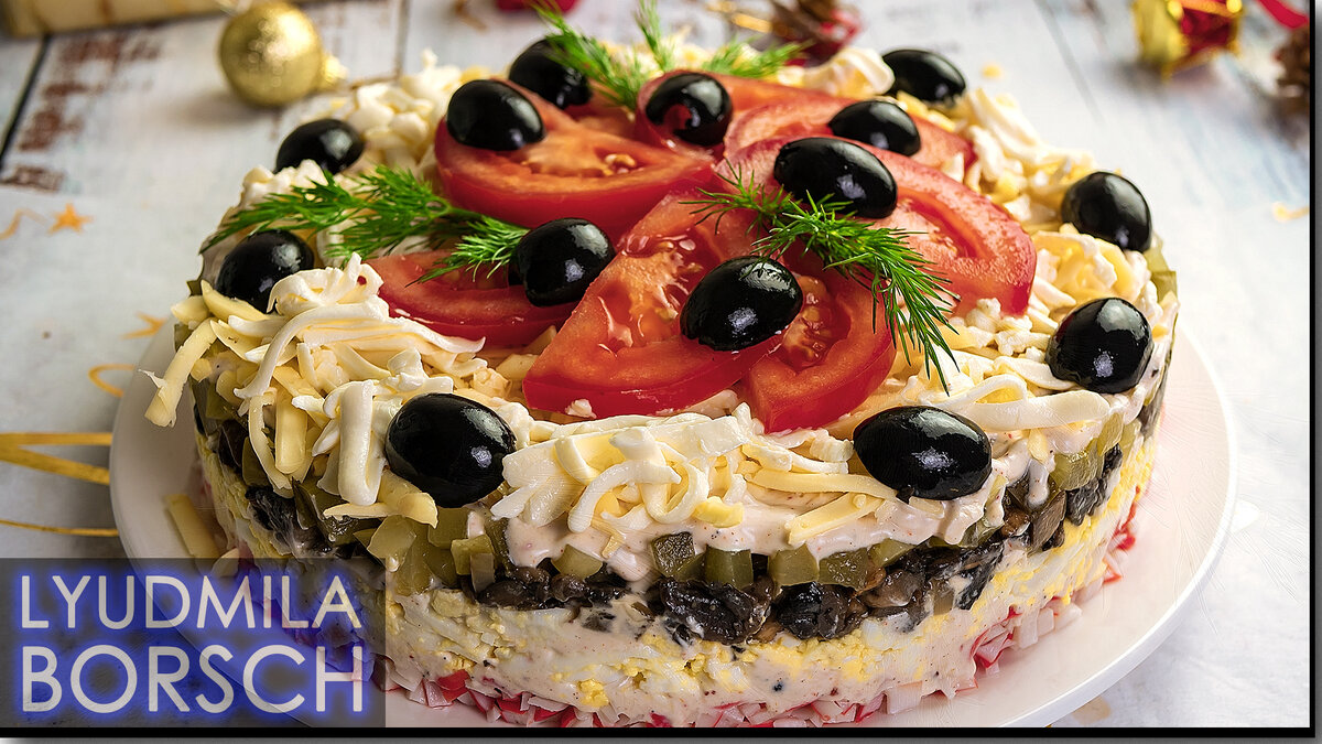 Ищете эффектный и вкусный салат для 8 марта? Приготовьте этот салат с крабовыми палочками и грибами! Простые ингредиенты, легкое приготовление, сочетание нежных крабовых палочек, ароматных грибов и пикантной заправки – этот салат станет настоящим фейерверком вкуса на вашем праздничном столе. Нарезаем крабовые палочки. Натираем сыр. Выкладываем половину. Затем крабовые палочки. Смазываем соусом. Натираем вареные яйца. Разравниваем, немного утрамбуем. И смазываем соусом. Берем соленые или маринованные огурцы. Желательно их выложить на бумажное полотенце. Грибы жарим на сливочном масле с луком. Даем остыть и выкладываем следующим слоем. Сверху соленые огурцы. И хорошая порция соуса. Следующий слой сыр. Плавленый сыр натираем на крупной терке. Украшаем помидорами и маслинами Необычное сочетание ингредиентов и простота приготовления сделают этот салат настоящим хитом вашего праздничного стола. Рецепт: Для соуса: