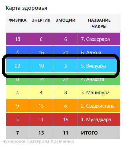Рассчитайте свою матрицу в калькуляторе. Смотрим три энергии в голубой строке Вишудха.