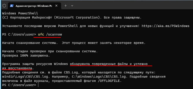 Если файлы операционной системы повреждены, можно воспользоваться проверкой целостности системных файлов windows. При проверке целостности файлов будет проведено восстановление всех поврежденных файлов. Для запуска проверки откойте терминал от имени администратора и выполните команду sfc /scannow Если были ошибки, то в сообщении указано имя и расположение файла с расширением .log В нем вы можете найти более подробное описание поврежденных и восстановленных файлов. У команды sfc — для проверки целостности файлов операционной системы, кроме атрибута /scannow проверка с исправлением, есть и другие атрибуты: sfc /scannow — Эта команда проверила целостность поврежденных файлов, при наличии повреждений — автоматически их исправила. sfc /verifyonly — С этим атрибутом произойдет проверка файлов без исправления найденных поврежденных файлов sfc /scanfile <путь до файла и имя_файла> — Сканирует целостность указанного файла (полный путь и имя файла) и пытается исправить любые проблемы, если они