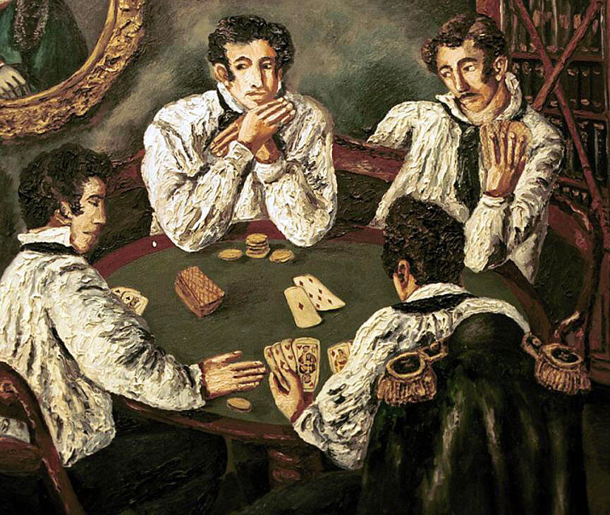 Александр Пушкин любил азартные игры. В лицейские годы писатель начал играть в карты: он видел в них поэзию риска, испытание судьбы. Самые популярные игры того времени — в «банк», или «штосс», — он воспел в «Пиковой даме». Позже с гордостью он писал в дневнике: Моя «Пиковая дама» в большой моде. Игроки понтируют на тройку, семерку и туза. Обычно писатель проигрывал. Перед Южной ссылкой 1820 года он поставил на кон рукопись первого сборника стихов и проиграл его. Выкупить сборник назад и издать удалось только через несколько лет. Пушкин и позже ставил свои неопубликованные произведения.