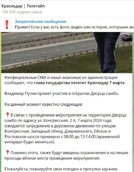 Жителей Краснодара предупредили о возможном временном ограничении движения автотранспорта 7 марта на некоторых улицах, когда в краевой столице ждут приезда президента РФ Владимира Путина. В микрорайоне Западный Обход надеются увидеть 7 марта главу государства Владимира Путина на долгожданном открытии «Дворца самбо» на улице Конгрессной, 2А. После появления неподтверждённой информации о возможном визите в Краснодар президента официальных опровержений со стороны местных властей не последовало. Между тем в социальных сетях краснодарцы делятся сообщениями в домовых чатах о том, что с утра и до обеда 7 марта «ожидается затруднение в дорожном движении» на улицах соседних с «Дворцом самбо»: Западном Обходе и Конгрессной, а также Ростовском и Ейском шоссе и улице Дзержинского. Скрин одного из постов в соцсетях - Помимо этого, также будут введены ограничения и на пешие проходы вблизи места проведения мероприятия, - сообщает тг-канал «Краснодар|Телетайп». Над ожиданием приезда президента успел п