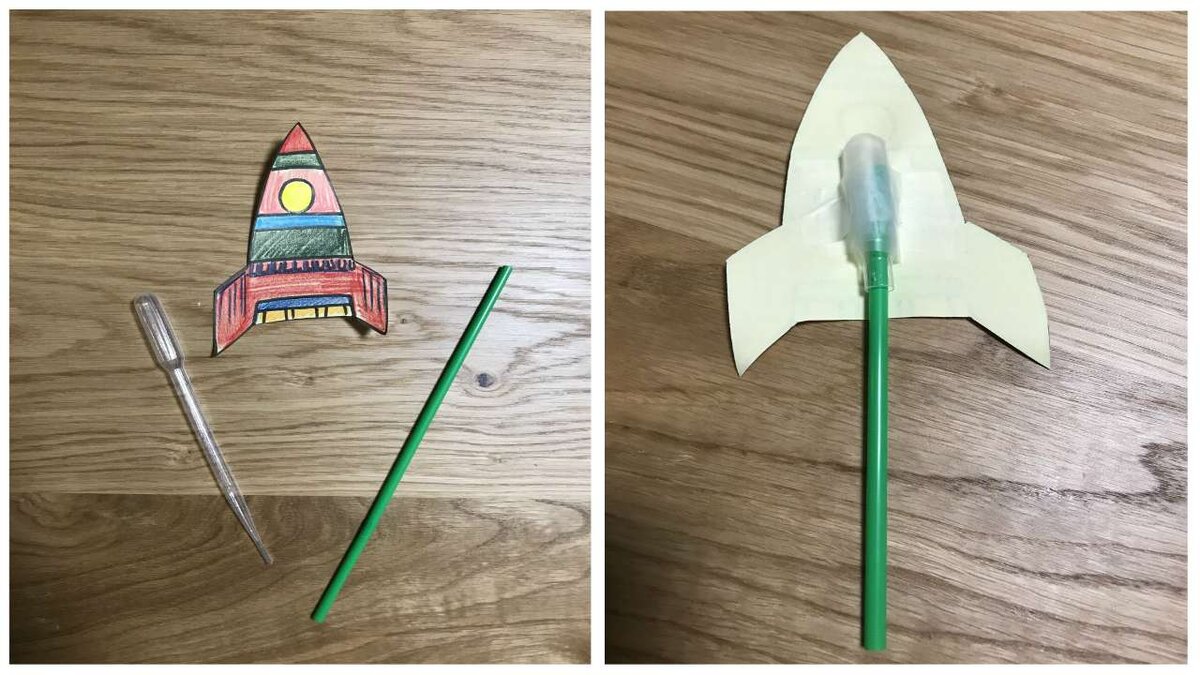 Главный символ Дня космонавтики — конечно же, ракета. Давайте не только сделаем её, но и объясним ребёнку, почему она летает. Возьмите бумагу, лучше поплотнее, нарисуйте ракету — вы сами выбираете, какого она будет цвета и размера. Можно изучить статьи о космосе в детских энциклопедиях и подсмотреть идеи там, написать на ракете её название, нарисовать в иллюминаторе лицо космонавта. Вырежьте нарисованную ракету и приклейте с обратной стороны при помощи скотча колпачок от шариковой ручки. Возьмите соломинку для коктейля и вставьте её в колпачок.
