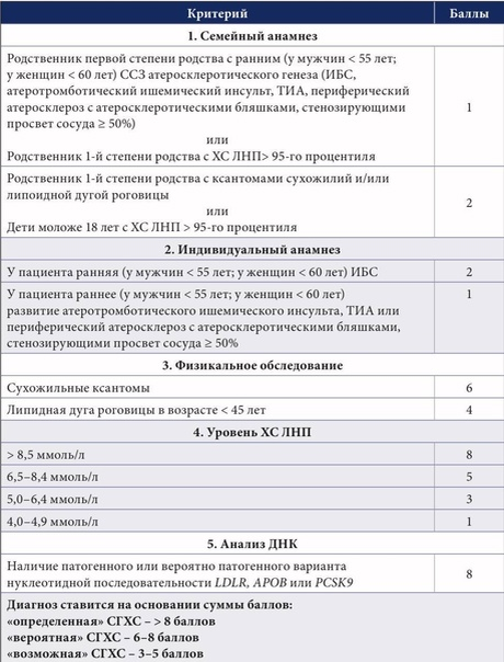 Разработаны критерии для диагностики семейной гиперхолестеринемии - как клинические, так и с учетом генетических тестов. Чаще всего применяют критерии голландских липидных клиник. Привожу их здесь.