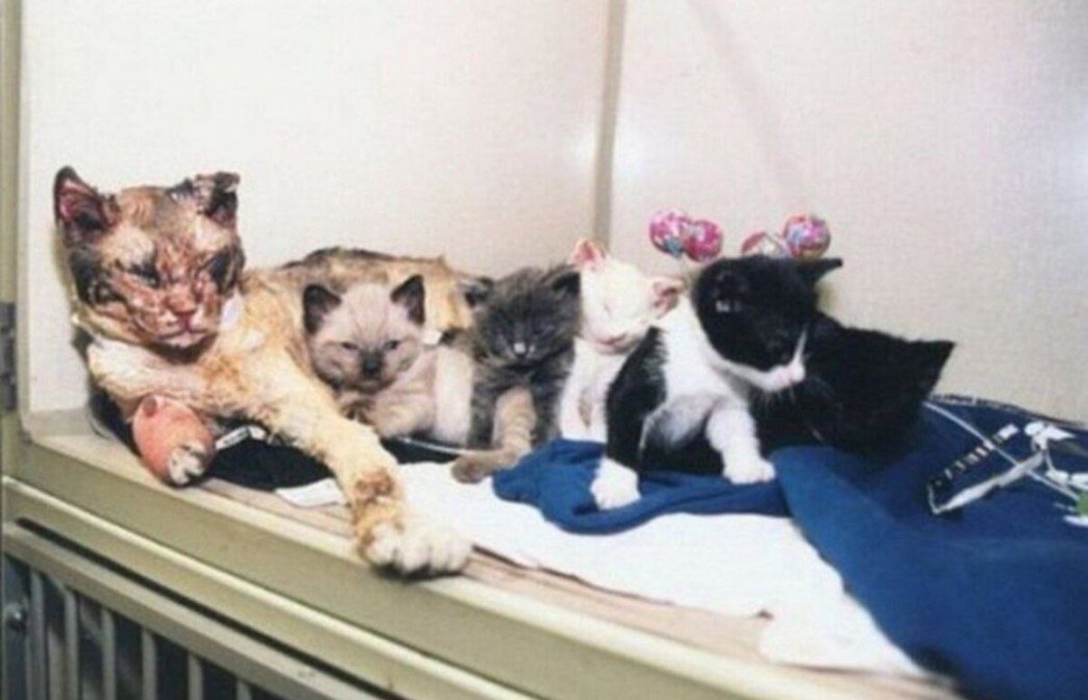 …Травку лечили долго. Ее держали в барокамере, делали переливания крови и диализ. Она лишилась части век, сильно обгорели уши, а нижнюю часть правой передней лапы пришлось ампутировать. Половину тела покрывали шрамы от ожогов. Ветеринары боролись за ее жизнь, считая спасение матери-героини делом чести. Руководство ветлечебницы, пораженное историей о героизме обычной кошки, приняло беспрецедентное решение - провести реабилитацию Травки совершенно бесплатно.