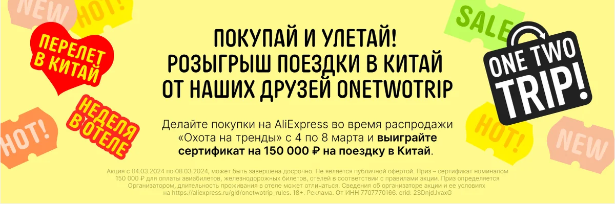 Покупая что-либо на специальном лендинге с 4 по 8 марта, есть шанс выиграть поездку в Китай. Подробнее о розыгрыше — по ссылке, а анонс победителей пройдет 15 марта. Покупайте новинки и хиты выгодно Розыгрыш поездки в Китай от OneTwoTrip. Делайте покупки на AliExpress во время распродажи "Охота на тренды" с 4 по 8 марта и выиграйте сертификат на 150 000 рублей на поездку в Китай. Еще больше товаров в акции "Охота на тренды". Переходите по ссылке, заказывайте товары на любую сумму и становитесь участником розыгрыша поездки в Китай. Наушники-вкладыши Xiaomi с шумоподавлением, Bluetooth 5,3, микрофоном Портативная игровая консоль R36S. Оценка 4,8. 3549 отзывов. 734 раза купили Смартфон Xiaomi Redmi Note 13 Pro 4G, MTK Helio, экран 6,67 дюйма AMOLED, 67 Вт, турбо-зарядка, 5000 мАч 40 189 ₽ -38%. Цена: 24 958 ₽ . Велосипед GMINDI, размер рамы 29 дюймов, 19/21 дюйма Оценка 4,9. 118 отзывов. 388 купили 57 595 ₽ -83% Цена 9 850 ₽
