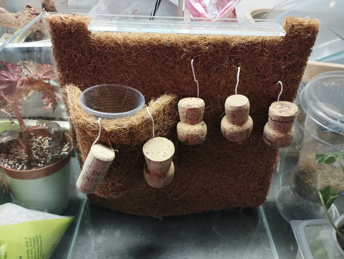 Ну что ж, глаза боятся, а руки делают. Тут я боялась А потом взяла и сделала. Сборка флорариума, снова покажу по шагам. Сначала банку надо было вымыть, но я пропустила этот шаг. Банка новая, куб 25х25х25см. Со стеклянной же крышкой. Вырезала коврик под размер задней стенки Коврик - кокосовый. Приличные люди покупают их в зоомагазинах, красиво упакованными в пакетик. Мы неприличные. Со мной одна цветочная коллега поделилась куском детского матраса. Кокосового, да. Моя задумка была - повесить что-то ампельное. По-хорошему надо бы было купить глину для флорариумов и слепить на задней стенке то что надо. Но глины нет. Поэтому я пришила нитками другой кусок коврика. Кстати, пробки на проволочках - заготовки для микро-орхидей. На них будет прикреплен мох и сверху малышки Хараелла Ретрокалла, как вот здесь делала с корой Дальше всë как всегда. Керамзит в качестве дренажа Древесная зола в качестве антисептика Здесь и толщина слоя керамзита видна. Запылëнного углëм, правда. Сверху грунт, обыч