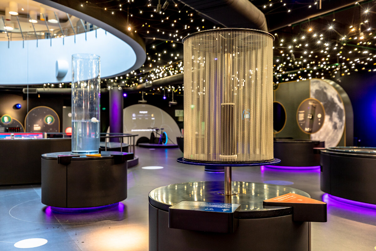Ответ иллюстрирует экспонат «Искривление пространства» в интерактивном пространстве «Лунариум». Экспонат состоит из цилиндра, где круглые основания соединены натянутыми, строго параллельными друг другу, ровными нитями, образующими боковую поверхность цилиндра, на которую направлен фонарь со светящимся треугольником. Основание цилиндра можно вращать. При его вращении цилиндр искривляется. Но при этом каждая нить остаётся прямой.