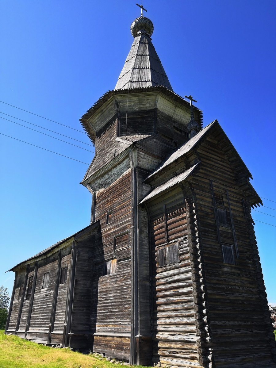 Пятиглавая зимняя в честь Тихвинской иконы Божией Матери. Построена на фундаменте обветшавшей старинной церкви в XIX веке, когда считалось, что в дереве нужно воспроизводить очертания каменной архитектуры. В путеводителях пишут, что красивой церковь никогда не была: тяжелый нечеткий силуэт, плохо читающиеся и слишком многочисленные мелкие детали. Мол, не лучшее проявление русско-византийского стиля. Приходится верить на слово - силуэтов не осталось. Зато сохранился замок на двери.