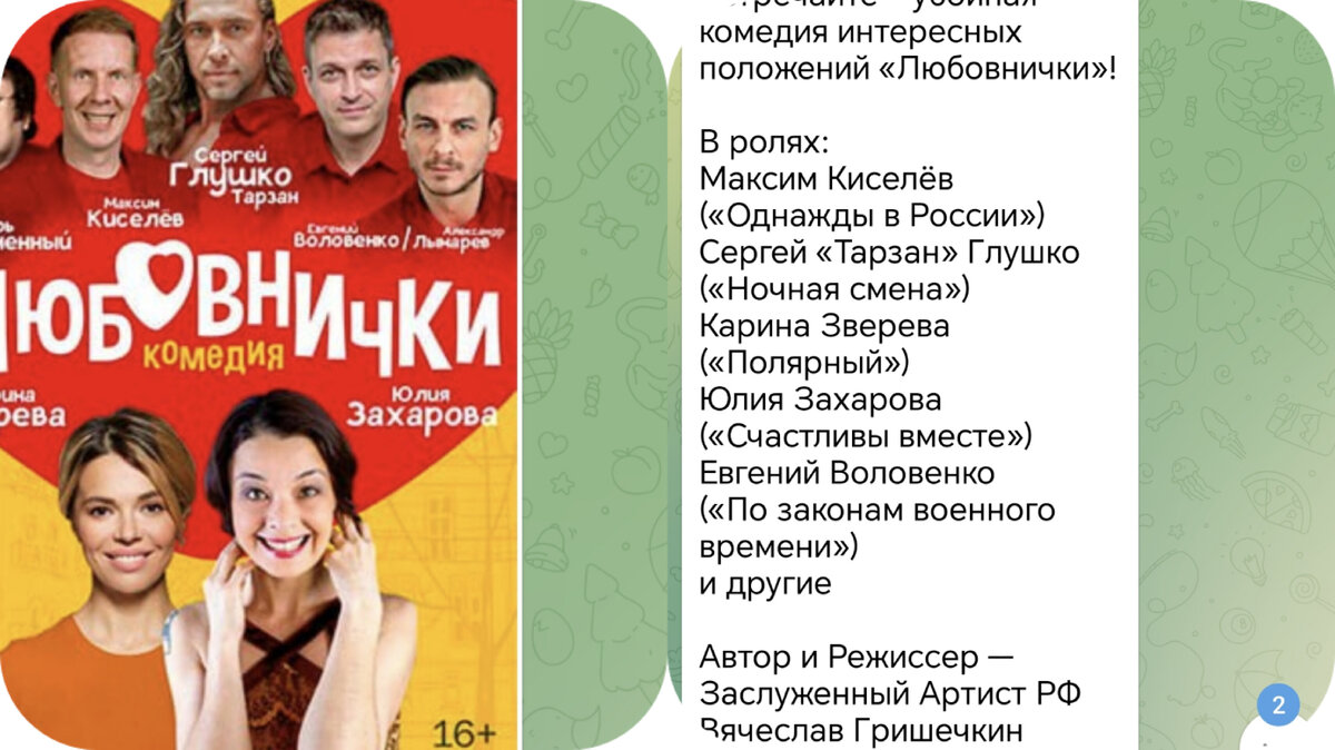 Здравствуйте, мои дорогие друзья и гости канала. Для тех, кто впервые заглянул на огонек, расскажу о себе: Меня зовут Светлана, мне 41 год и я похудела на 23 кг с марта 2022 года. Рост 161 см, начальный вес 90 кг. Худею по системе "Гибкая диета", чередую интуитивное питание и подсчёт КБЖУ. На своем канале я веду дневник похудения, а так же делюсь понравившимися рецептами, рассказываю историю своей жизни. Хохочу, мои дорогие. Иногда пишу название статьи, и предполагаю, о чём могут подумать мои читатели, прочитав заголовок? А речь сегодня пойдет о нашем походе в театр. Подарила сестричке билет на 8 марта в театр Им.Тургенева на комедию "Любовнички". Долго гадала, что бы такого придумать, а тут в телеграмм канале "Орелконцерт" промокод прислали с 30% скидкой. Звёзды сошлись. Себя, конечно же, приложила. Ну, думаю, пойдем окультуриваться. Народа было не мало, но зал не полностью заполнен. И вот начинается спектакль. Сначала показалось немного нудно, а потом хохотали от души. Комедия в п