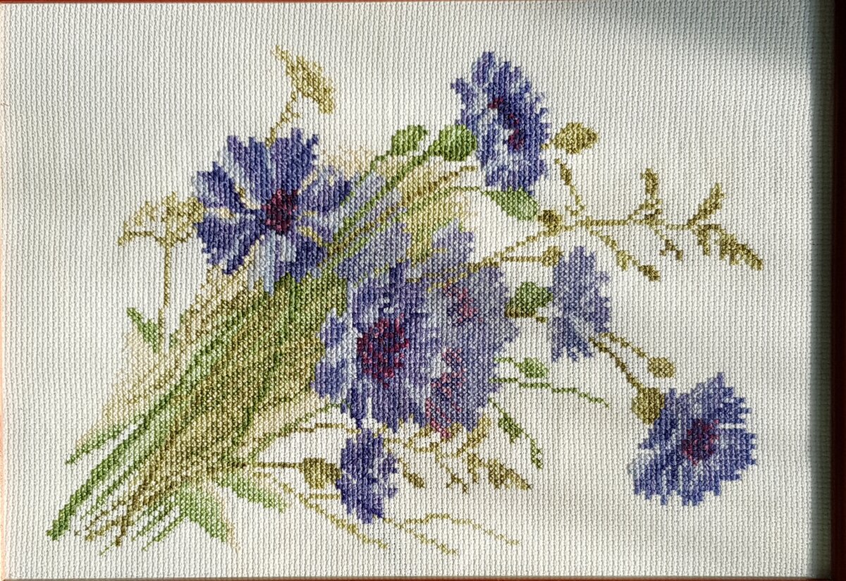 Добрый день всем любителям вышивки крестиком. Сегодня я покажу свои очень скромные завершенные работы. Одна среднего размера и три малютки. Самая первая вышивка в моей жизни это набор Васильки от Марьи-искусницы. Гуляли мы как-то с подругой после пар в магазине тканей и увидела этот набор и так он мне понравился, что я его купила даже не думая сложно это или нет. Какие-то миниатюры были там наверно, но не зацепили меня. И тк я шила вручную и на машинке немного, разного, от постельного белья, до простых платьев, то я подумала, что довольно быстро справлюсь с этой вышивкой. Но не получилось быстро, отшивала примерно 6 лет, большую часть этого времени набор лежал, вышивала как-то никуда не торопясь и занималась им скорее от скуки, чтобы развеяться) Это сейчас я понимаю, что для новичка это сложный набор, тут есть крестики в 1 нить, неполная зашивка, близкие оттенки ниточек. И тут у меня разное направление крестиков, ошибка наверное многих начинающих вышивать. Сам набор очень хороший и мул