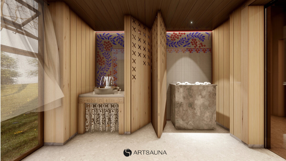 Слово о бане русской Печь: Sangens Материалы: ольха 140 мм, МДФ в шпоне дуба. Опции: фонтанчик, светодиодная подсветка, мозаика, дверная ручка под заказ, панорамное окно. Баня, в которой идеально сплелись старорусский стиль и современность. Это вольная интерпретация актуальных банных и интерьерных тенденций от нашего дизайнера. Такая баня гармонично впишется в отреставрированную усадьбу, загородный концептуальный клуб или частный дом со схожей идеей. «В последнее время в интерьерный дизайн стало популярно внедрять отличительные славянские элементы. И мы решили перенести их в парную. Так на полках появилась лазерная гравировка по дереву с характерным орнаментом», - пишет о концепции бани дизайнер Таша. Главный нестандартный элемент парной - фонтанчик, который идеально вписался в концепт помещения. (Мы были в восторге от этой интеграции. И подумали: как же раньше мы этого не сделали?) Для него была придумана деревянная тумба с фрезой, а в роли чаши выступил узнаваемый тазик. Под констр