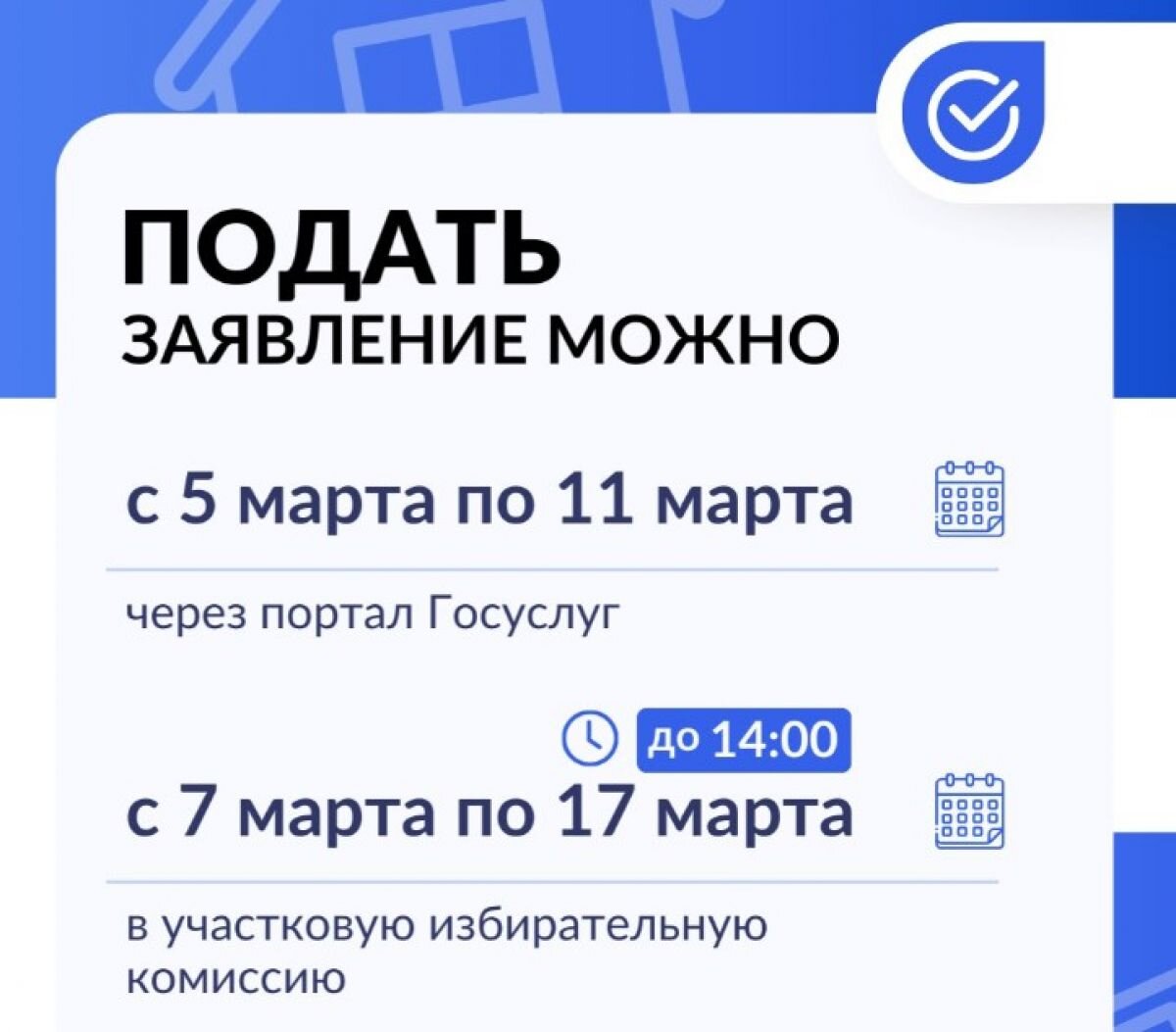 5 марта стартовала подача заявлений о голосовании на выборах Президента России на дому. «Если избиратель не сможет прийти на свой избирательный участок в дни голосования по состоянию здоровья, инвалидности, в связи с необходимостью ухода за лицами, в этом нуждающимися, или по иным уважительным причинам, то он сможет проголосовать на дому», – сказал председатель избирательной комиссии Тульской области Павел Веселов. С 5 по 11 марта заявление о голосовании на дому можно подать через портал «Госуслуги». С 7 по 14.00 17 марта для того, чтобы проголосовать на дому, нужно обратиться в участковую избирательную комиссии письменно или устно (по телефону) – самостоятельно или через родственников, знакомых. Выборы Президента России состоятся 15, 16 и 17 марта.